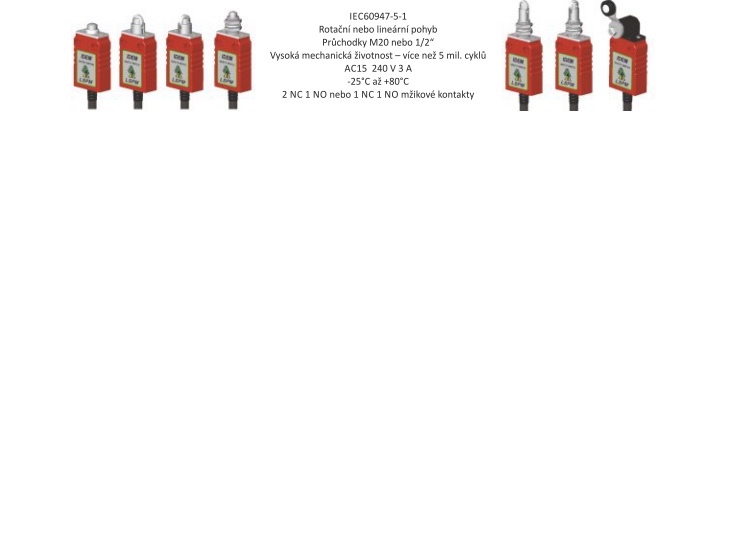IEC60947-5-1 Rotační nebo lineární pohyb Průchodky M20 nebo 1/2“ Vysoká mechanická životnost – více než 5 mil. cyklů AC15 240 V 3 A