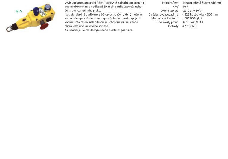 Vyvinuto jako standardní řešení lankových spínačů pro ochranu dopravníkových tras v délce až 80 m při použi 2 prvků, nebo 60 m pomoc