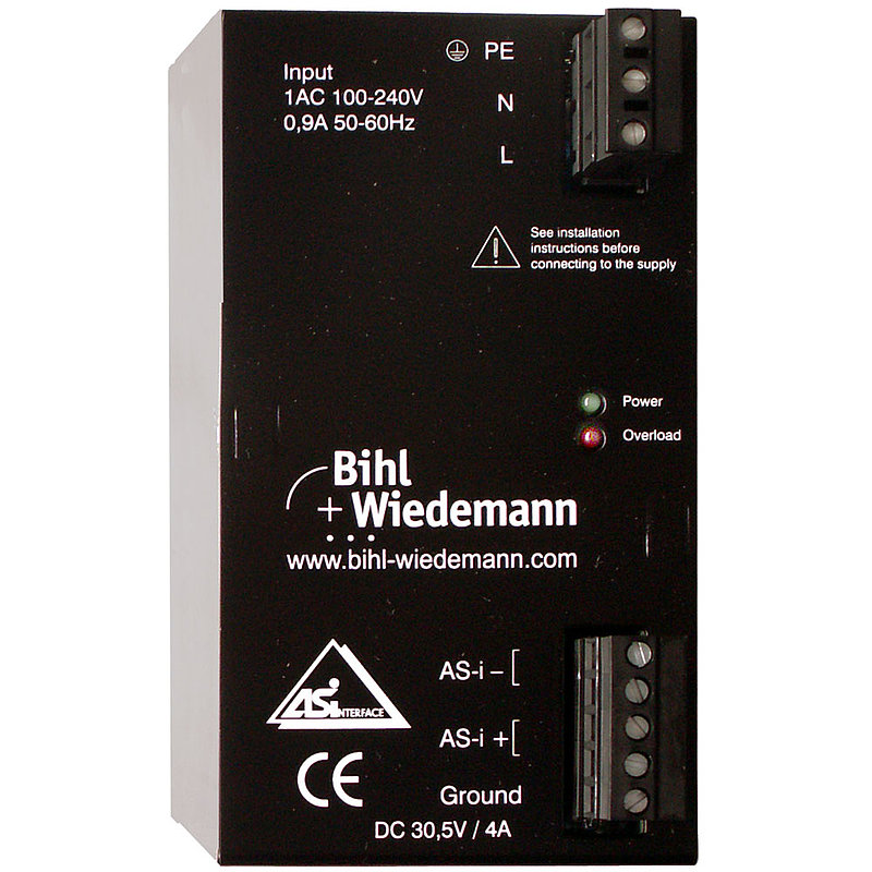 ASi Power Supply, 4 A, 90 V AC ... 265 V AC, wide range switch, IP20 Suitable for all ASi Gateways and Safety Monitors from Bihl + Wiedemann.