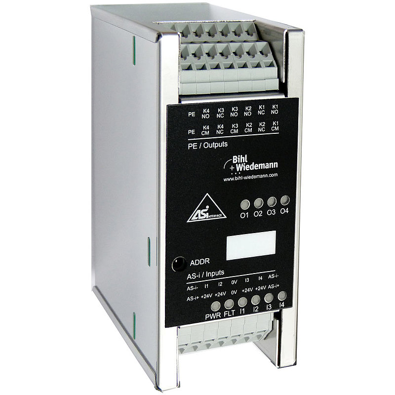 ASi Digital I/O Module in Stainless Steel, IP20, depth 90 mm, 4 digital inputs, 4 relay outputs, input voltage/sensor supply out of ASi, periphery connection via clamps, ASi connection via clamps, 1 single address