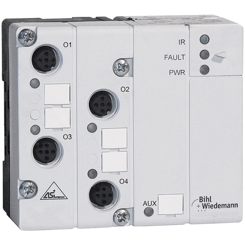 ASi Analog Output Module in IP65, width 90 mm, with 4 x M12 sockets, 4 analog outputs (0...10 V), signal at pin1/pin3, output voltage/actuator supply out of ASi or out of AUX, auto switching, periphery connection via 4 x M12 sockets, 5 poles, ASi connection via profile cable and piercing technology, 1 single address There is a successor to this article › BWU3107