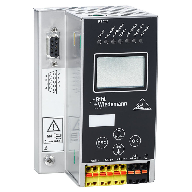 ASi-3 Modbus Gateway in Stainless Steel, 2 ASi masters, integrated decoupling, max. 4 A per ASi circuit, ASi current measurement in the gateway, diagnostic and configuration via RS232 diagnostic interface, duplicate address recognition, ASi fault detector, IP20