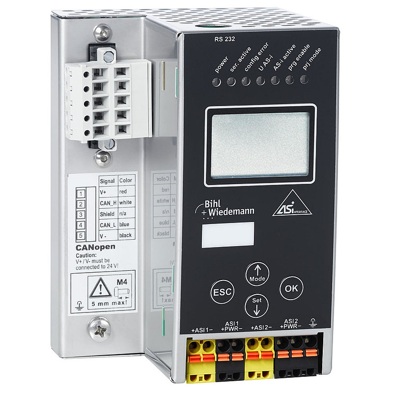 ASi-3 CANopen Gateway in Stainless Steel, 2 ASi masters, diagnostic and configuration via RS232 diagnostic interface, duplicate address recognition, ASi fault detector