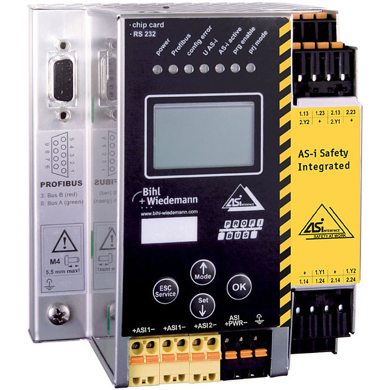 ASi-3 PROFIBUS Gateway with integrated Safety Monitor, 1 ASi master, 1 power supply for 2 ASi networks, 4 digital inputs, expandable to max. 62 x 2 channels safe inputs, 2 release circuits (2 x 2 relay outputs), expandable to max. 16 safe outputs, diagnostic and configuration via RS232 diagnostic interface, duplicate address recognition, ASi fault detector, IP20