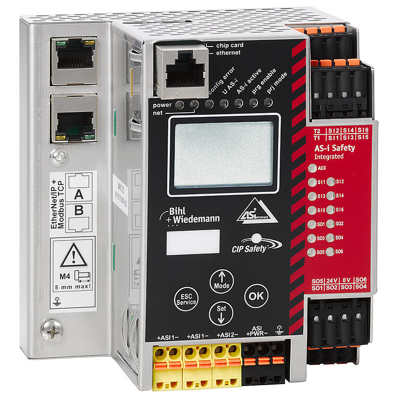 ASi-3 CIP Safety over EtherNet/IP + ModbusTCP Gateway with integrated Safety Monitor, 2 ASi masters, 1 power supply for 2 ASi networks, 6 digital inputs or 3 x 2 channels safe inputs (SIL 3, cat. 4), expandable to max. 62 x 2 channels safe inputs, 6 release circuits (6 x electronic safe outputs), expandable to max. 64 safe outputs, CIP Safety via EtherNet/IP, diagnostic and configuration via Ethernet/IP + Modbus TCP or Ethernet diagnostic interface, duplicate address recognition, ASi fault detector, programming in C optional, IP20