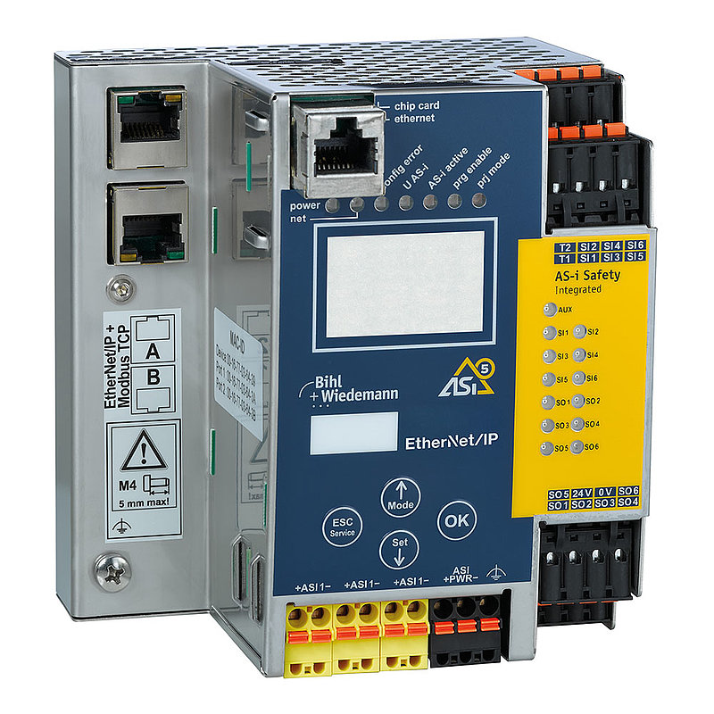 ASi-5/ASi-3 EtherNet/IP + ModbusTCP Gateway with integrated Safety Monitor, 1 ASi-5/ASi-3 master, OPC UA server, integrated decoupling, max. 4 A per ASi circuit, ASi current measurement in the gateway, 6 digital inputs or 3 x 2 channels safe inputs (SIL 3, cat. 4), expandable to max. 31 x 2 channels safe inputs, 1891 x 2 channels safe inputs in max. configuration, 6 release circuits (6 x fast electronic safe outputs), expandable to max. 31 safe outputs, 991 safe outputs in max. configuration, Safe Link, diagnostic and configuration via Ethernet/IP + Modbus TCP or Ethernet diagnostic interface, duplicate address recognition, ASi fault detector, programming in C optional, IP20